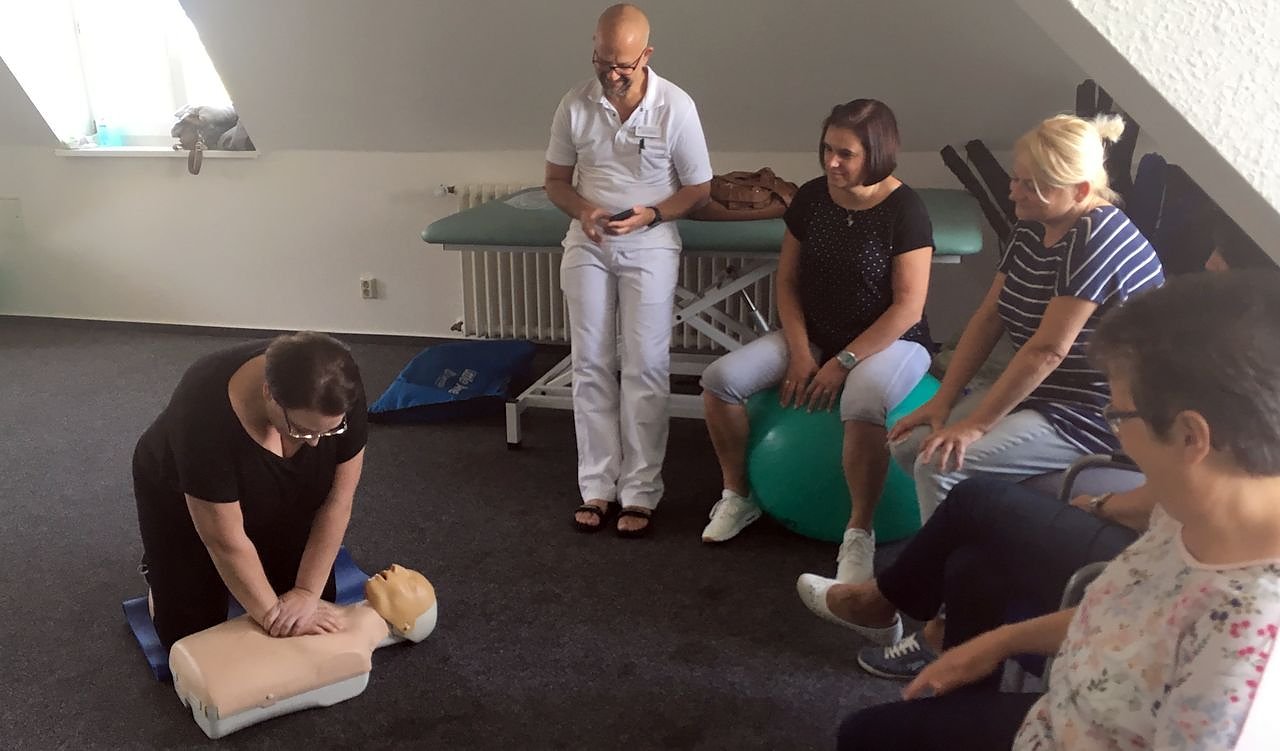 Wie die Reanimation dann korrekt durchgeführt wird, konnten die Besucherinnen üben und sich überprüfen lassen. Dabei kamen sie ganz schön ins Schwitzen. Nach dem körperlichen Einsatz waren sie sich jedoch einig: Diese Auffrischung war gut und wichtig. Zwar hoffe man, niemals in so eine Situation zu kommen, doch gerade in einem medizinisch-pflegerischen Umfeld fühle man sich mit aktuellen Grundlagen der Notfallreanimation sicherer. Auch Dr. Olaf Rose appelliert dazu, die eigenen Reanimationskenntnisse regelmäßig aufzufrischen.