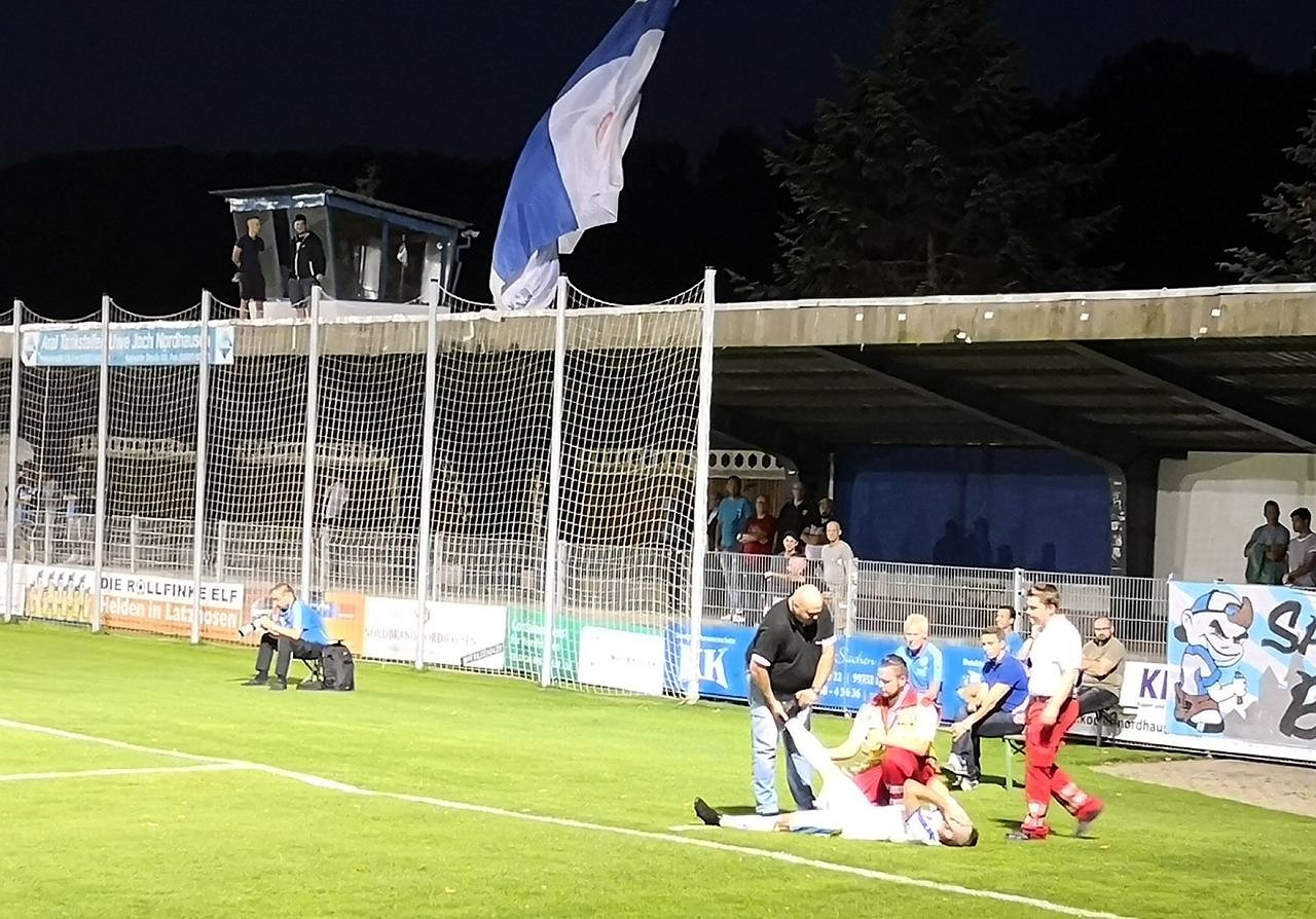 Wacker-Präsident Nico Kleofas fungiert als Sani beim Kampf gegen einen Krampf