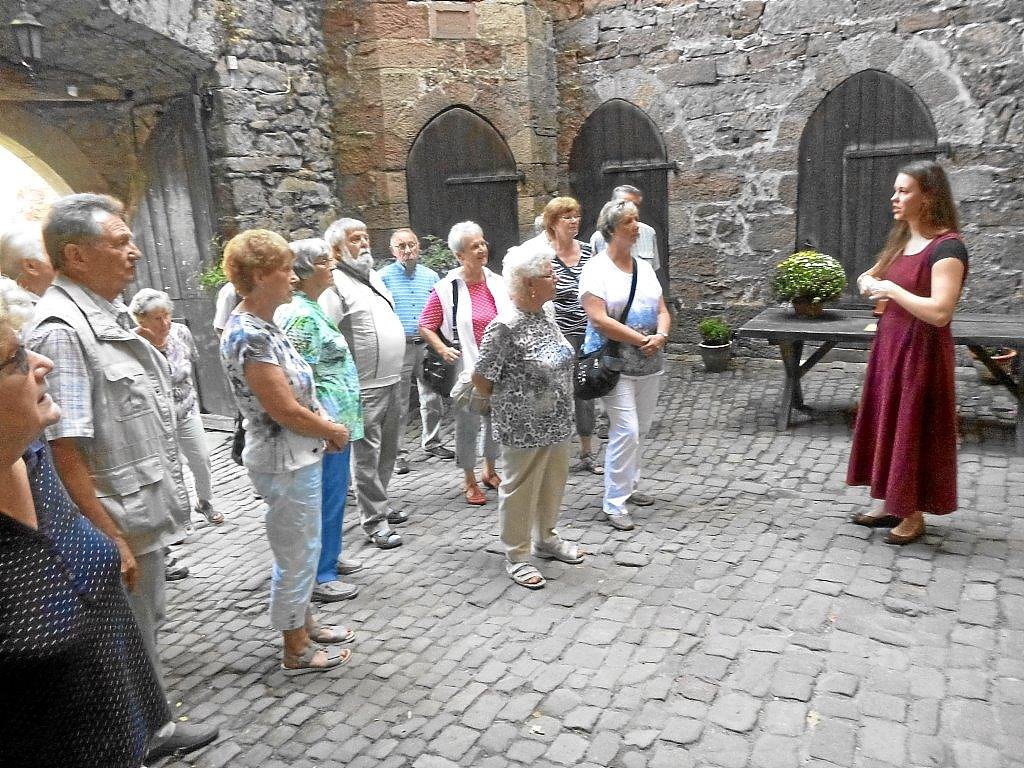 Mit historisch-authentische Innenräume bietet das Schloss ein außergewöhnliches Ambiente, das über 19 Generationen liebevoll erhaltern und renoviert wurde. Sehenswert sind sie alle: Rittersaal, Restaurant, Ahnengalerie, Standesamt, Museum, Kaminofen. Nicht minder interessant die Kapelle und der Friedhof mit den Ahnengräbern. Die Nordhäuser Reisgruppe der Landsenioren hörte aufmerksam zu, was Burgfräulein Sonja alles zu berichten wusste.