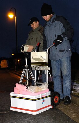 Zwei Männer lauern am Straßenrand, eine Geschwindigkeitskontrolle im verkehrsberuhigten Bereich in Nordhausen Ost? Fast sieht es danach aus, aber die Technik von Olaf Hesse und Volker Wiegand wirft ihren Blick auf die Gebäude. Gemeinsam mit der Energieversorgung Nordhausen und der delta GmbH aus Leipzig untersucht das Institut für Maschinen, Antriebe und elektronische Gerätetechnik (IMG) Gebäude auf Wärmeverlust und bauliche Mängel.