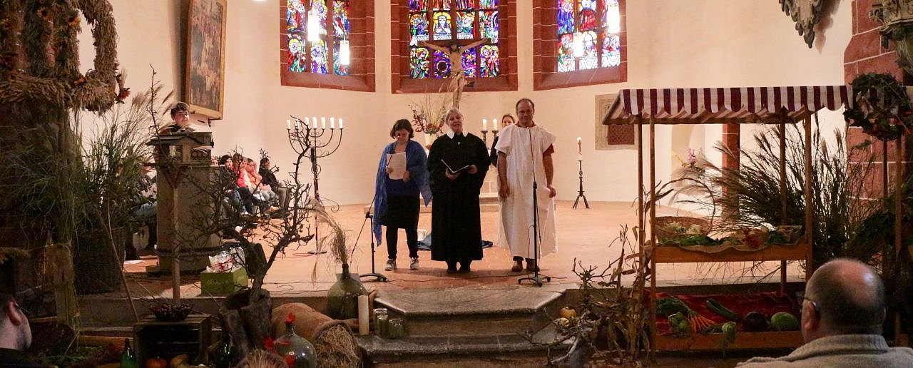 Mit dem Herbstschmuck hatte man sich in diesem Jahr bewusst zurückgehalten, von Überfluss keine Spur, schon die Dekoration ließ vermuten das es in diesem Erntejahr weniger zu danken gab als sonst.