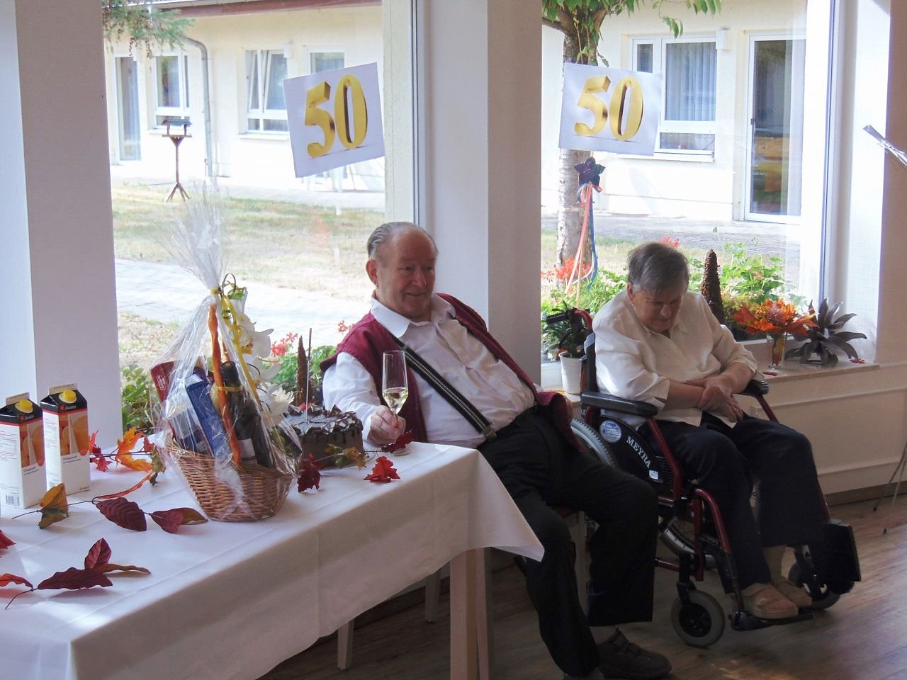 Harald Gocht erzählte vom Kennenlernen seiner Frau, während sich Ursula Gocht den Erinnerungen hingab. Ja, lang ist´s her, vielleicht trifft man sich wieder in 10 Jahren, ergänzte Ursula Gocht ihren Mann. Zur Mittagszeit erwarte man Besuch aus der Familie, man möchte gemeinsam zu Tische sitzen und erzählen. Hierfür wurde eine festliche Tafel in der Cafeteria hergerichtet. Familie Gocht bedankte sich für die liebevolle Ausgestaltung der Stunde, einen tollen Präsentkorb sowie eine leckere Schokotorte mit goldener Fünfzig.