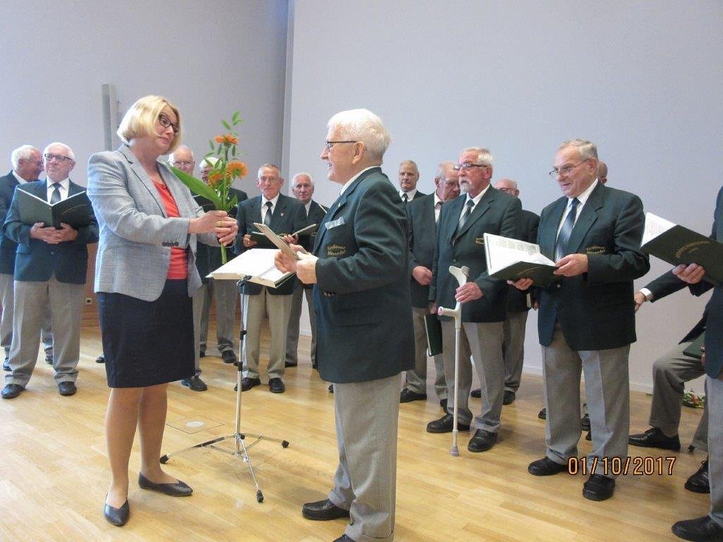 Horst Dieter Stockhausen gehört mit 81 Jahren zu den ältesten Sangesfreunden im Nordhäuser Männerchor. Bürgermeisterin Jutta Krauth zeichnete ihn für 60-jährige Mitgliedschaft im Bürgerhaus aus. Foto: privat