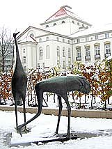 Die Kranich-Plastiken am Nordhäuser Theater ist von Unbekannten erneut beschädigt worden. Der städtische Bauhof hat die beiden Figuren inzwischen entfernt und an einem sicheren Ort eingelagert. Bauamtsleiter Jens Kohlhaus: Bürger haben uns heute darauf aufmerksam gemacht, dass die Plastiken beschädigt wurden. Vor Ort hat sich herausgestellt, dass an dem aufrecht stehenden Kranich offensichtlich so stark gewackelt wurde, dass seine Beine an der Grundplatte fast komplett durchgebrochen sind. Der Bauhof habe die Gruppe inzwischen entfernt und eingelagert. Für die Zukunft müsse man überlegen, wie die Beine des Kranichs randalierungssicher gemacht werden könnten. Zunächst müsse allerdings die Finanzierung der Reparatur geklärt werden.