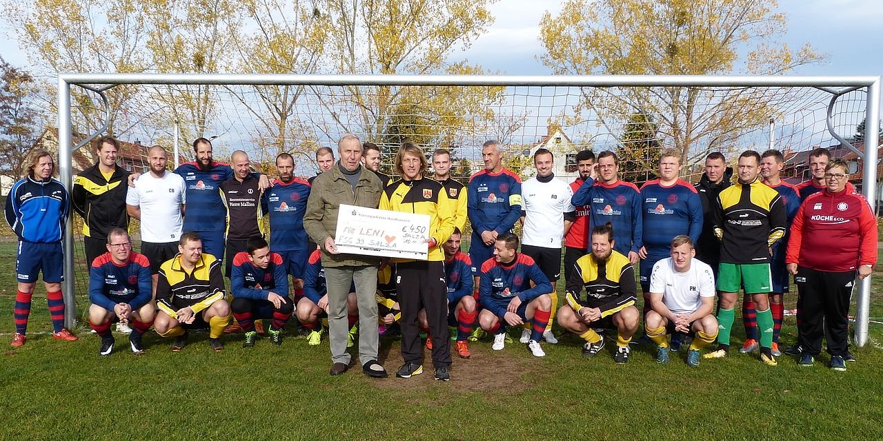 Lenis Papa, René Feyer, ist Fußballer beim SV Hohnstein Neustadt. Sein Team war heute im Punktspiel der Kreisklasse zu Gast bei Salzas Dritter. Die Übergabe des symbolischen Schecks erfolgte vor Spielanpfiff.