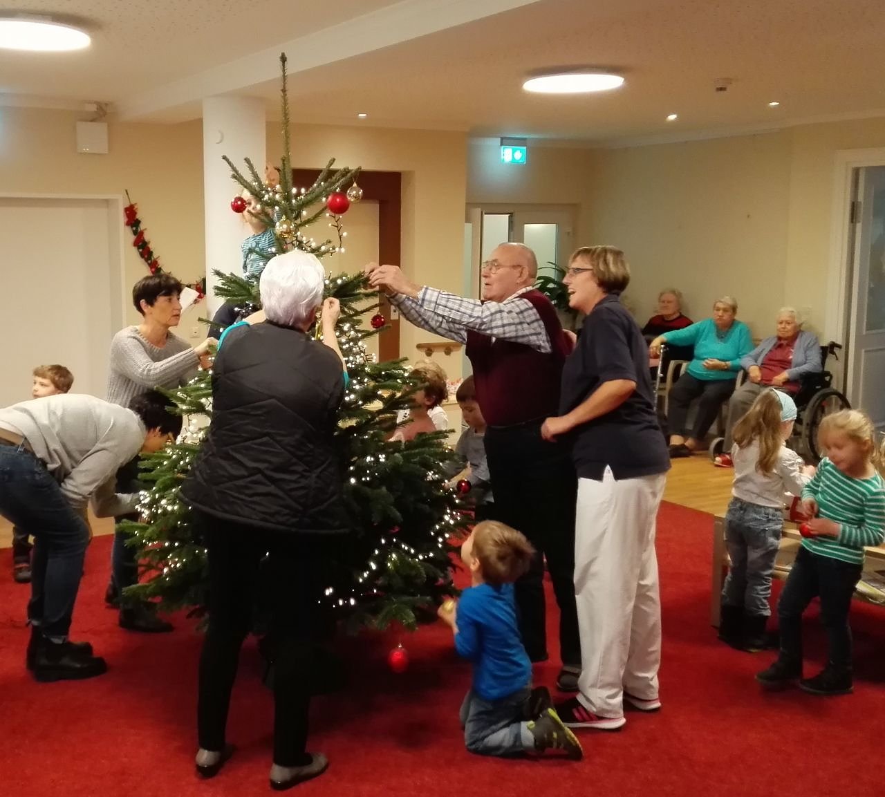 Fix war der Baum mit Licht, Kugeln und Sternenspitze geschmückt. So stand er dann da in seiner ganzen Pracht, bis beim einschalten der Lichter ein raunen und staunen aus Kindermund mit großen Augen durch das Foyer ging. Nachdem sich die erste Aufregung um das Weihnachtsbaumschmücken gelegt hatte, sangen alle gemeinsam bekannte Winter und Weihnachtslieder wie zum Beispiel Rolf Zuckowskis Jahresuhr und Weihnachtsbäckerei oder das Regenbogenlied sowie Schneeflöckchen Weißröckchen. Aufgeregt aber sehr gesprächig waren die kleinen Strolche als sie auf Nachfrage, was sie sich denn vom Weihnachtsmann wünschten, antworteten. Zu schnell verging die Zeit an diesem Vormittag, die Kinder sowie die Erzieherinnen bedankten sich für die Einladung und wünschten den Senioren eine schöne Advents- und Weihnachtszeit.