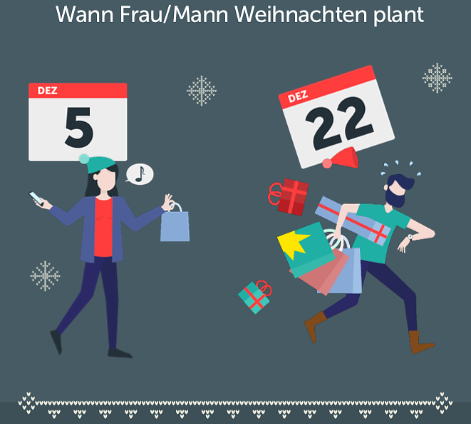 Während Frau hier bereits am 5. Dezember mit dem Geschenkeeinkauf beginnt, stürzen sich die meisten Herren erst ab dem 22. Dezember in das vorweihnachtliche Getümmel in den Geschäften. Nicht verwunderlich also, dass viele Frauen sich hier lieber selbst darum kümmern - sie übernehmen etwa doppelt so häufig den Geschenke Einkauf, als Männer.