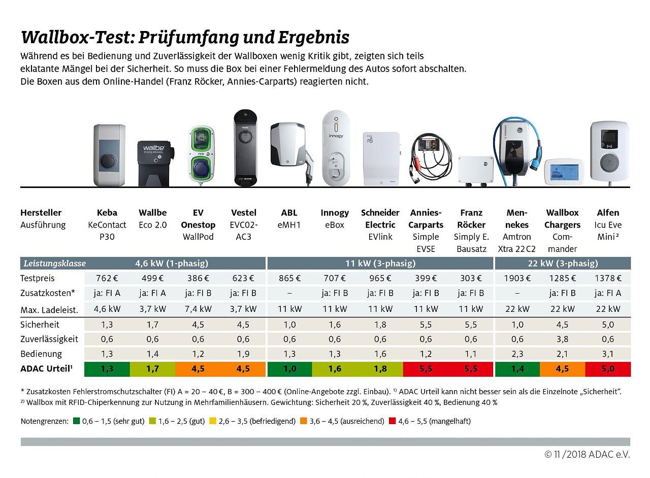 Der ADAC warnt vor den beiden im Internet erhältlichen Billiggeräten von Annies-Carparts und Franz Röcker (Note jeweils 5,5). Die Ladeboxen schalten bei einer Fehlermeldung den Strom nicht ab. Dies ist extrem gefährlich und kann zu einem Brand oder zu Personenschäden führen.