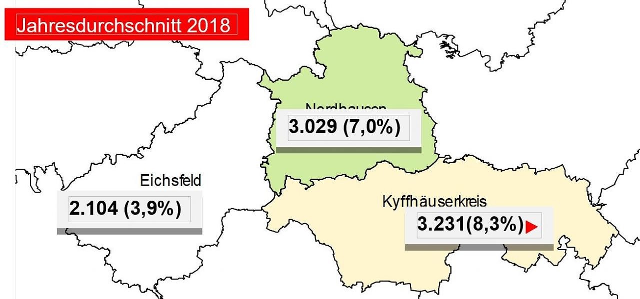 Die Arbeitslosigkeit sank in allen drei Landkreisen. In Nordhausen ging die Arbeitslosenquote im Jahresverlauf und verglichen mit dem Vorjahr von 7,5 auf 7,0 Prozent zurück. Durchschnittlich 3.000 Personen waren 2018 hier ohne Arbeit.Von November auf Dezember stieg die Arbeitslosigkeit um 105 auf 2.927 Personen gestiegen. Das waren 191 Arbeitslose weniger als vor einem Jahr. Die Arbeitslosenquote auf Basis aller zivilen Erwerbspersonen betrug im Dezember 6,8%; vor einem Jahr belief sie sich auf 7,3%. Dabei meldeten sich 693 Personen (neu oder erneut) arbeitslos, 77 weniger als vor einem Jahr und gleichzeitig beendeten 593 Personen ihre Arbeitslosigkeit (–81).