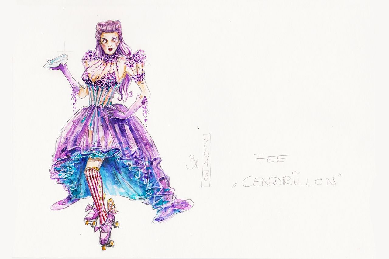 Für die fantasievollen Märchenkostüme zeichnet Kostümbildner Andreas Becker verantwortlich, der auch das Bühnenbild für die Inszenierung entworfen hat. Seine Figurinen, die farbigen Kostümentwürfe, nach denen die Theaterschneiderei die wunderschönen Kleider anfertigt, vermitteln einen ersten Eindruck von der märchenhaften Ästhetik der Inszenierung. Da scheint ein von Staub und Asche gezeichnetes Aschenbrödel in ihrem Arbeitskleid auf bloßen Füßen fast zu schweben und strahlt schon die Eleganz aus, die es in der Zeichnung im weißen Traum von Ballkleid dann tatsächlich hat. Da posieren zwei herrlich überzeichnete Stiefschwestern und eine ebenso skurrile Stiefmutter in ihren Roben für den großen Ball. Da erscheint die Fee in zartem Lila mit passender Perücke und Rollschuhen. Und der König könnte der Illustration eines Fantasyromans entsprungen sein.