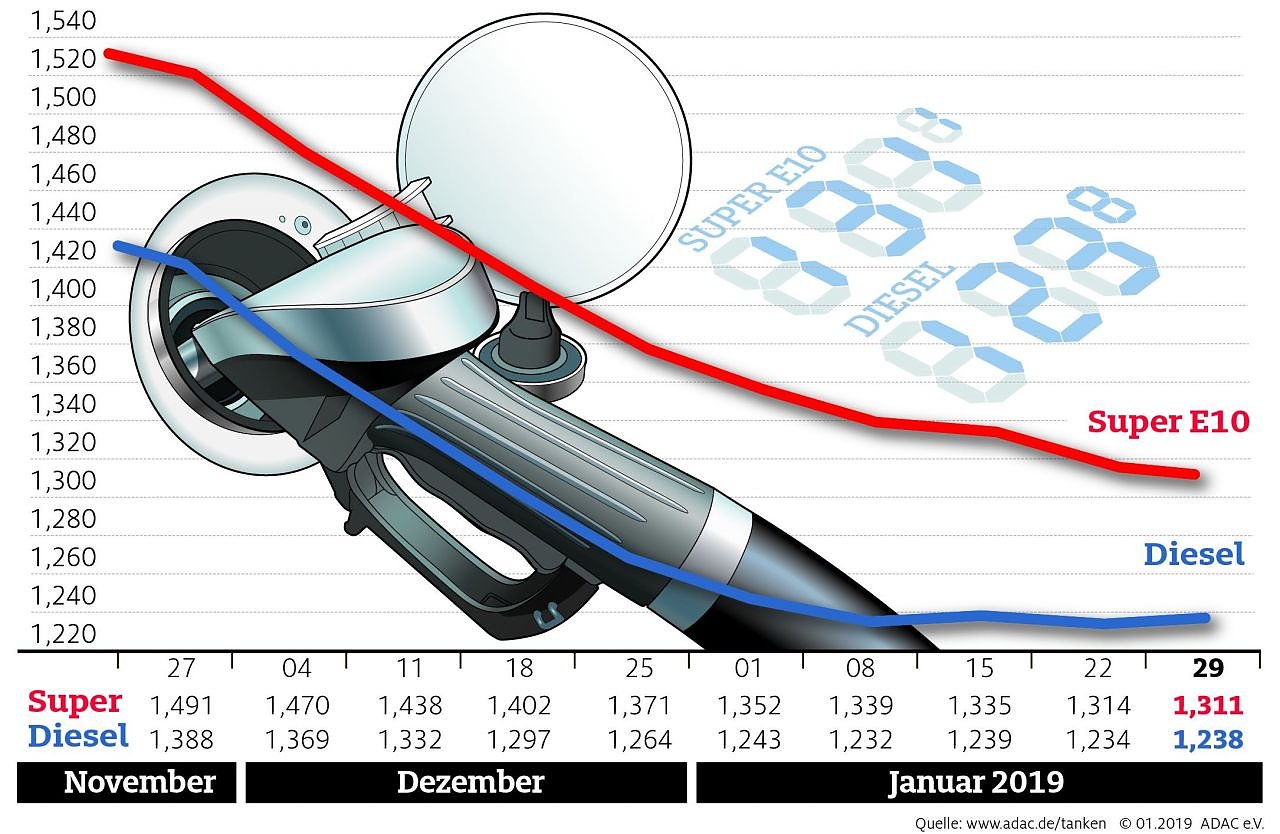 Die Preisdifferenz zwischen Benzin und Diesel wird immer geringer. Im Vergleich zur Vorwoche müssen Autofahrer für einen Liter Super E10 im Bundesdurchschnitt 1,311 Euro bezahlen, ein Rückgang um 0,3 Cent. Damit ist Benzin so günstig wie zuletzt im März 2018. Ein Liter Diesel verteuerte sich hingegen um 0,4 Cent auf 1,238 Euro...