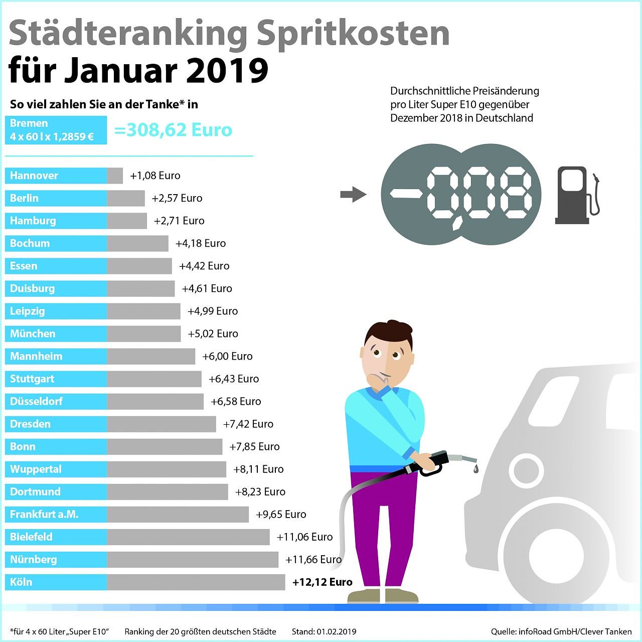 Beim Vergleich der 20 größten deutschen Städte von Clever Tanken belegte für die Sparte Super E10 zum vierten Mal in Folge Bremen den ersten Platz. 1,2859 Euro kostete der Liter hier im Schnitt. Auf den Plätzen zwei und drei der günstigsten Super-E10-Städte folgten Hannover (1,2904 Euro) und Berlin (1,2966 Euro). Hamburg ist mit 1,2972 Euro pro Liter zum ersten Mal nach zwölf Monaten dauerhafter Präsenz in den Top drei auf Platz vier abgerutscht.Am meisten zahlten Autofahrer pro Liter Super E10 im Januar in Köln (1,3364 Euro), Nürnberg (1,3345 Euro) und Bielefeld (1,3320 Euro). Vier Tankfüllungen à 60 Liter Super E10 kosteten im günstigen Bremen 308,62 Euro – und damit 12,12 Euro weniger als im teuren Köln.