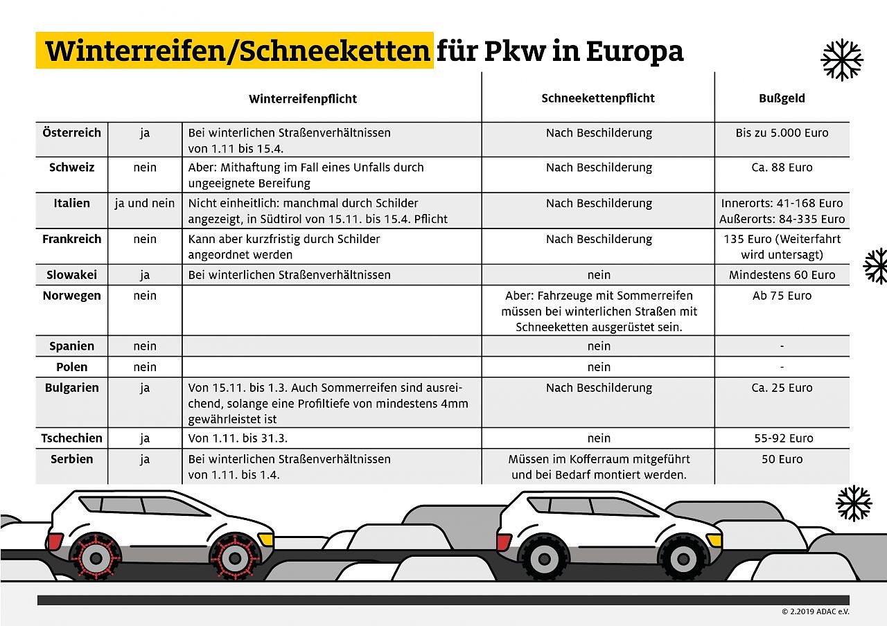 Wer also in Richtung Alpen oder anderer Skigebiete unterwegs ist, sollte sich vorher über die gelten Bestimmungen informieren und gegebenenfalls Winterreifen aufziehen oder Schneeketten in den Kofferraum packen.