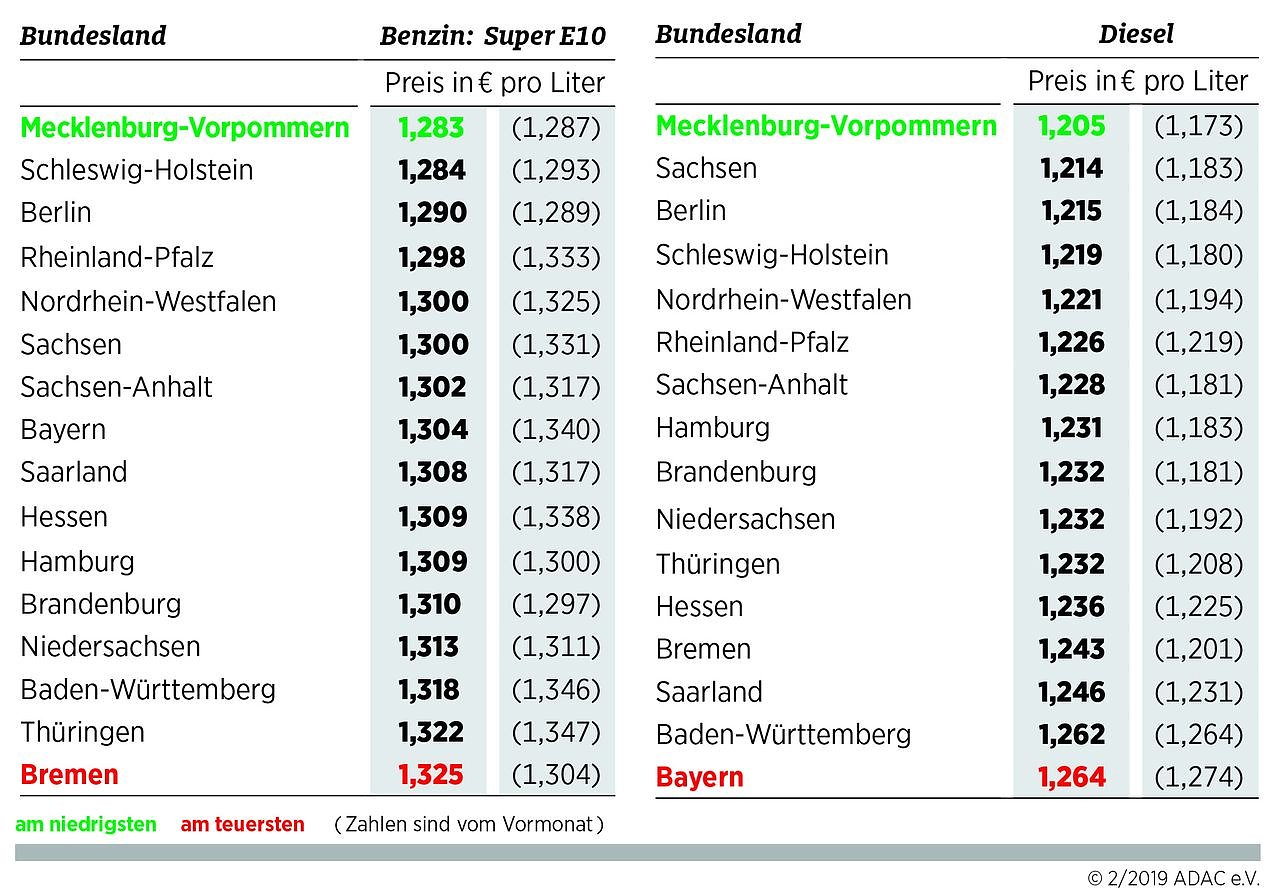 Noch größer ist die Differenz bei Diesel: Hier liegt der Literpreis in Mecklenburg-Vorpommern im Landesschnitt mit 1,205 Euro um 5,9 Cent unter dem teuersten Bundesland Bayern (1,264 Euro).
