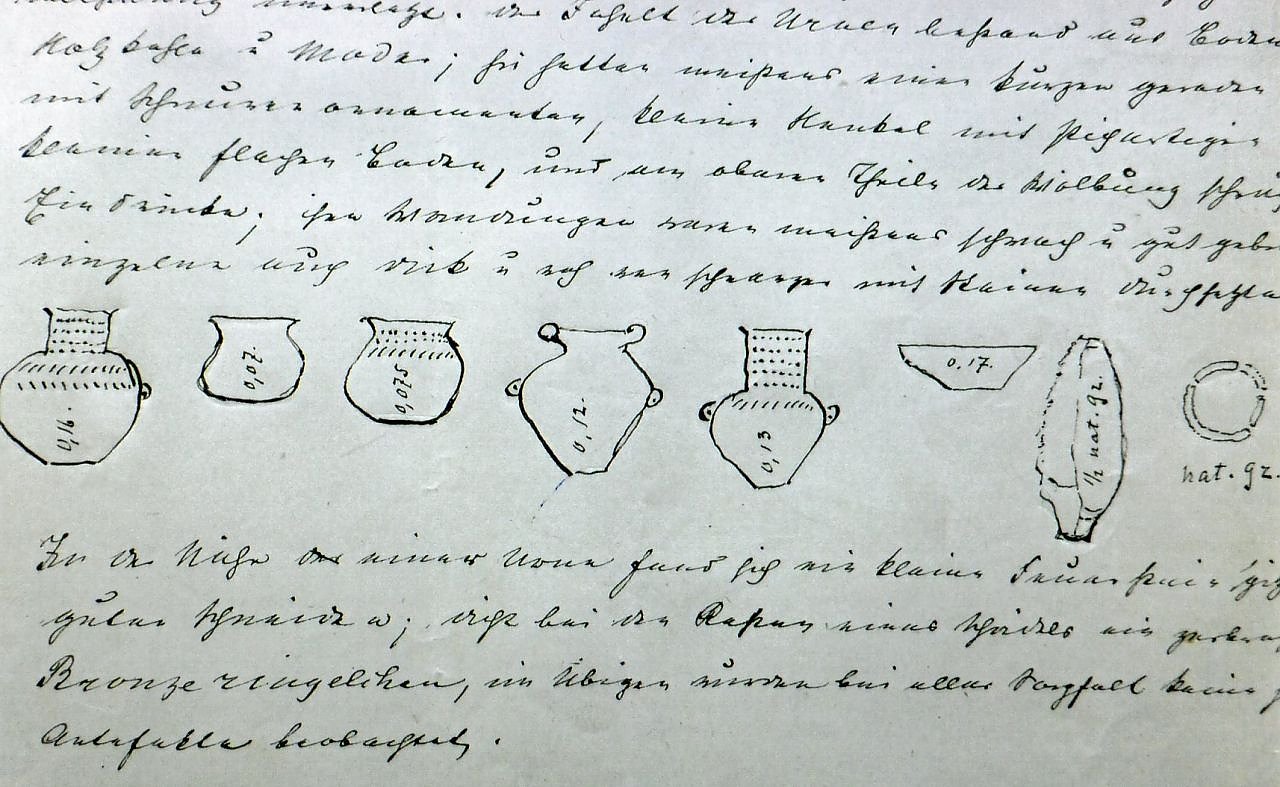 Hermann Arnold aus Nordhausen ist daran entscheidend beteiligt, denn er grub in den genannten Jahren als Mitglied des Geschichts- und Altertumsvereins Nordhausen 60 Hügelgräber aus. Im Stadtarchiv in Nordhausen befinden sich darüber seine handschriftlichen Grabungsberichte. Er selbst gab sie nicht heraus, sondern erst eine nächste Generation veröffentlichte diese 1925 in einer Zeitung. Arnold arbeitete eng mit dem Museum für heimatliche Geschichte und Altertumskunde der Provinz Sachsen in Halle zusammen. Seine Schrift ist gut lesbar, der Inhalt detailreich verfasst. Auch Zeichnungen sind eingefügt. Über die Ausgrabungen am Solberg gibt es am 6.4 also viel Aufschlussreiches zu erfahren. -