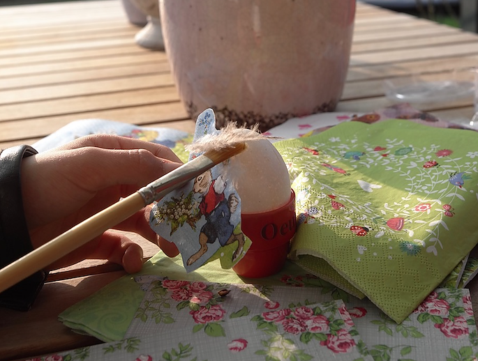 Wer möchte, kann auch mit Hilfe von Serviettentechnik die Eier mit selbstgewählten Motiven bekleben oder mit heißem Wachs Ornamente aufbringen und zum Schluss mit Perlen, Federn und Bändern verzieren. Jedes Kind darf natürlich seine Kunstwerke am Ende mitnehmen und am heimischen Osterstrauß aufhängen.