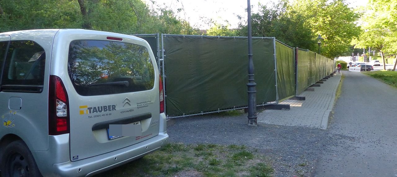Das übernehmen auch heute die Männer der Firma Tauber, die nach ersten Arbeiten mit einem kleinen Bagger das Erdreich mit einer Sonde absuchen. Seitens der Stadtverwaltung scheint man davon auszugehen, dass dort auch Kriegszeug gefunden wird. Hat man deshalb einen Sichtschutz angebracht?