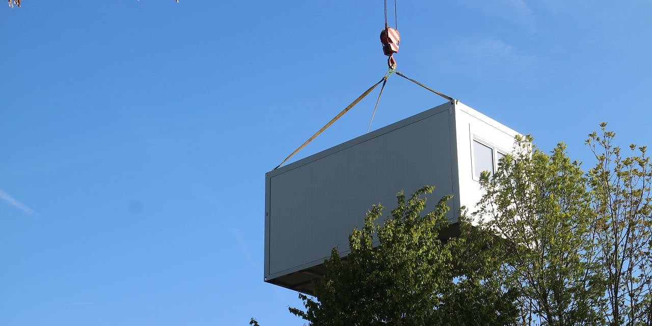 Die einzelnen Container werden einfach aneinandergesetzt und zusammengesteckt, lediglich die Medien für Strom, Heizung und Sanitär müssen noch angeschlossen werden. Im Laufe der Woche sollte das geschehen sein, dann kann der Umzug der Tiere beginnen.