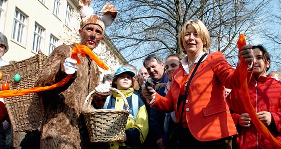 Hunderte Besucher drängten sich bereits um 11.00 Uhr zur Eröffnung vor dem neuen Eingang des Petersbergs. Sie wollten alle den Banddurchschnitt der Oberbürgermeisterin Barbara Rinke erleben und danach das Gelände erstürmen.Die versteckten Ostereier waren schneller weg als die Verantwortlichen der Stadt gedacht hatten. Niemand war auf einen derartigen Ansturm gefaßt gewesen. Das schöne Wetter lockte sicher zusätzlich vor die Türen in den Stadtgarten.