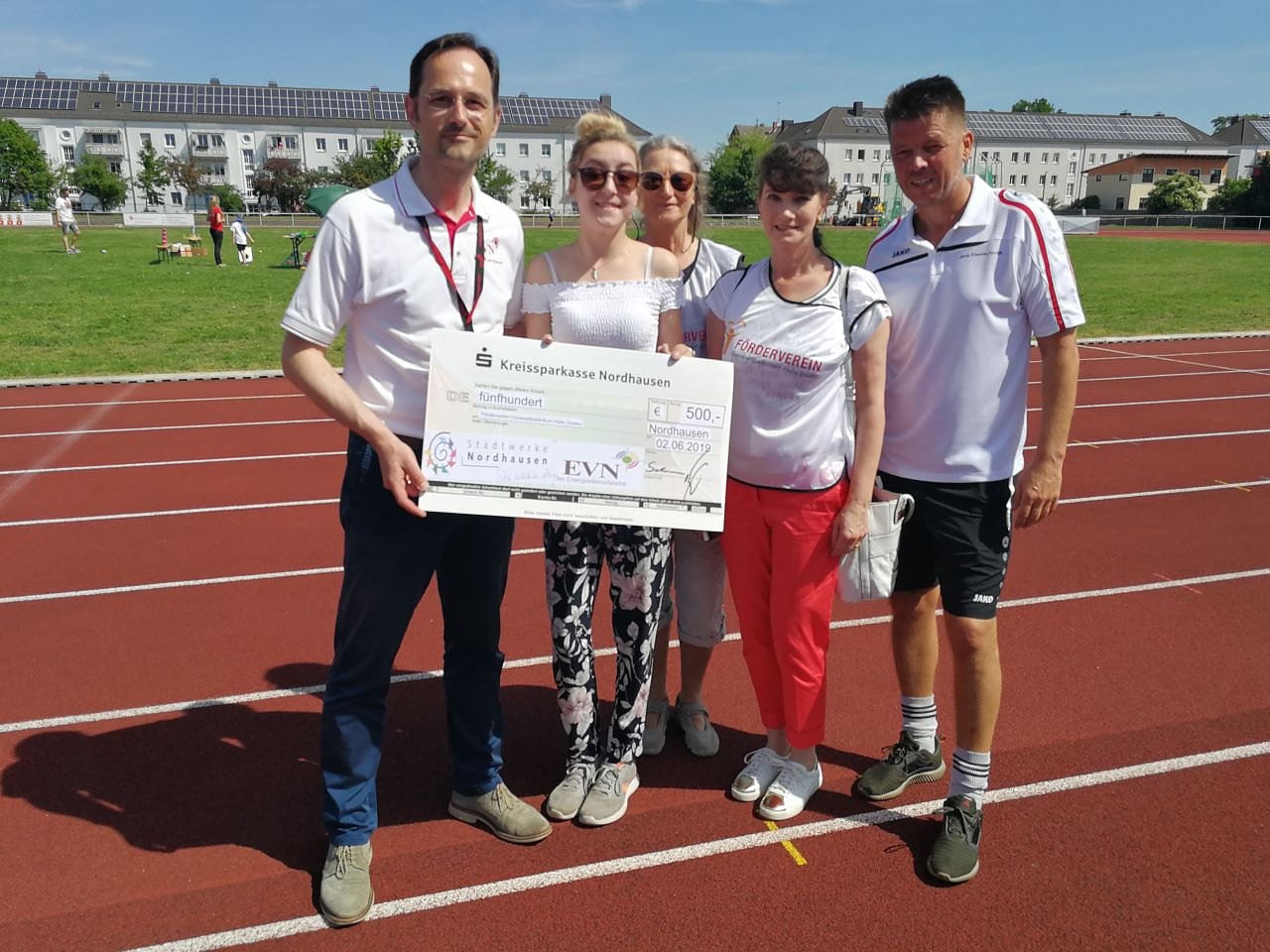 Die Stadtwerke-Firmenstaffel konnte im 30 Minutenlauf mit 22 gelaufenen Runden ihren sportlichen Beitrag zu der gelungenen Veranstaltung leisten. Am Ende der Veranstaltung wurde ein Spendenscheck in Höhe von 500,00 € von Herrn Eisenschmidt, Geschäftsführer der Badehaus Nordhausen GmbH (rechts) und Herrn Meißgeier, Prokurist & Leiter Vertrieb und Handel bei der Energieversorgung Nordhausen GmbH (links) zur Unterstützung von Patienten, die an Mukoviszidose erkankt sind, übergeben.