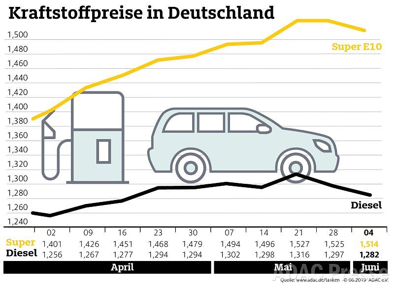Nach den Jahreshöchstständen im Mai können Autofahrer wieder etwas preiswerter tanken. Laut aktueller Auswertung des ADAC verbilligte sich Super E10 gegenüber der Vorwoche im Bundesdurchschnitt um 1,1 Cent auf 1,514 Euro je Liter. Für einen Liter Diesel muss man im Mittel 1,282 Euro bezahlen, ein Rückgang um 1,5 Cent...