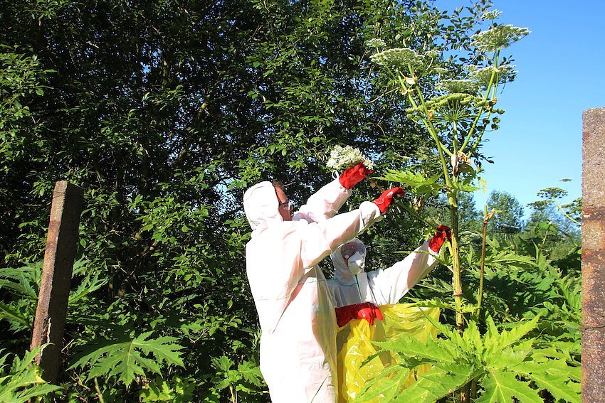 Bei der Beseitigung der giftigen, aus dem Kaukasus stammenden Pflanze tragen die Mitarbeiter Schutzkleidung und Feinstaubmaske.