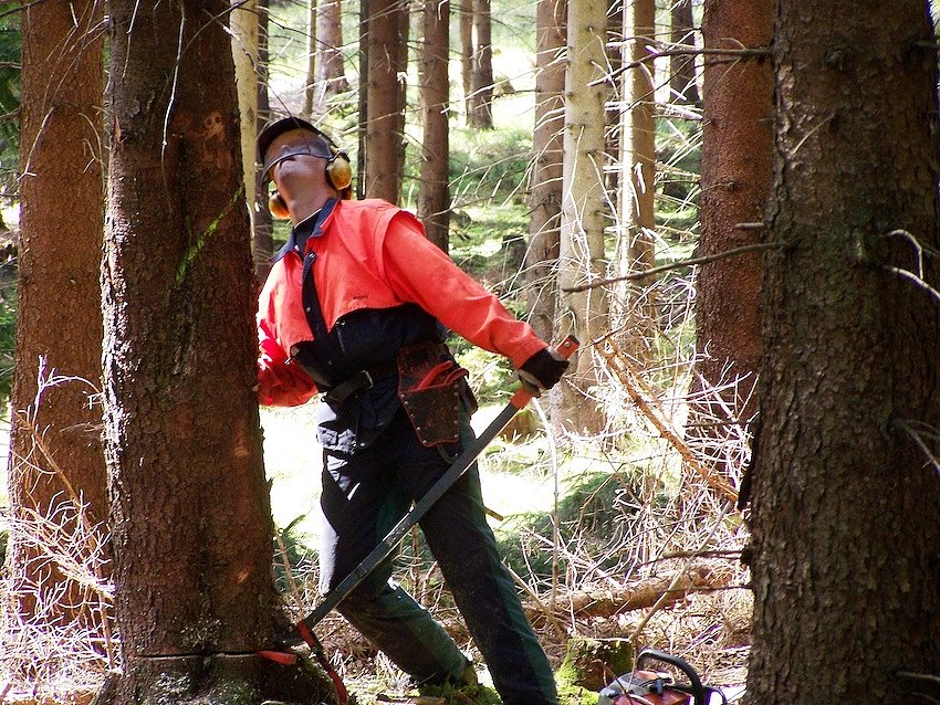 Denn wer Bäume fällt, der muss eine vollständige Arbeitsschutzbekleidung tragen. Neben dem Schutzhelm mit Ohr- und Gesichtsschutz ist dies eine Schutzjacke, Handschuhe, eine armierte Schnittschutzhose und trittstabile Schnittschutzschuhe mit Stahlkappen. Da kommen schnell sieben Kilogramm Gewicht allein für die Schutzausrüstung zusammen. Zusätzlich verursacht der Werkzeuggurt mit Kluppe, Maßband und Kettenschärfwerkzeug weitere Pfunde. Hinzu kommen rund fünf Kilogramm Motorsägengewicht, weitere fünf Kilogramm für den Benzin-Öl-Kombikanister. Auch Spalthammer und Fällkeile muss der Forstwirt zumindest zum Fällort tragen – im Zweifelsfall liegt dieser am Steilhang. Doch damit nicht genug: Mit dem Einsatz der Motorsäge stehen die Forstwirte oft genug in ihrer eigenen Abgaswolke. Bei Temperaturen über 35° C wahrlich kein Zuckerschlecken.