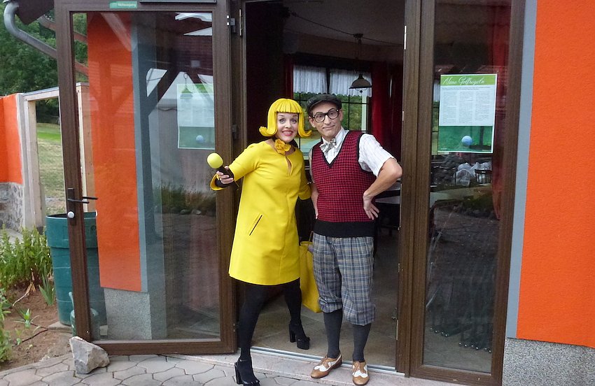 Mit einer weiteren Überraschung warteten die Veranstalter am Abend auf. Mit einem kleinen Showprogramm war die Überraschung den beiden Sponsoren absolut gelungen. Frau Bartuschke aus Berlin (BATUSCHKE - Visuelle VerbalComedy) zeigte mit einem Partner moderne Pantomime verbunden mit gekonnter Moderation. Natürlich stand im Fokus der Show der Golfsport.