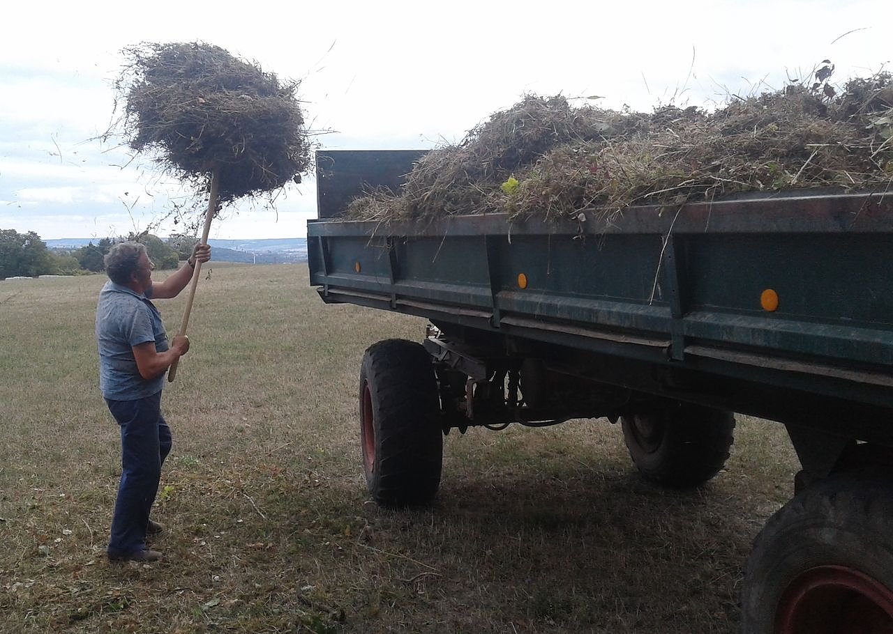 Die von uns gemähten Flächen sind nicht groß, die anfallende Biomasse ist entsprechend überschaubar. Je nach Aufwuchs wird ein normaler Treckenanhänger aber durchaus gut gefüllt. Mitunter fällt auch deutlich mehr an (zum Beispiel bei Rüdigsdorf). Hat vielleicht der ein oder andere Pferdebesitzer oder haben andere Landwirte Interesse?