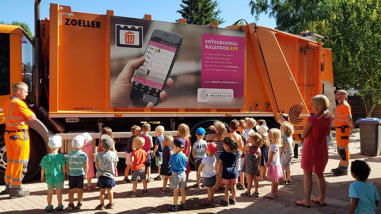 Zur Veranschaulichung kam sogar ein Entsorgungsfahrzeug vorbei, in das alle Kinder mal reinschauen durften und sich hinter das Lenkrad setzen konnten. Die Mitarbeiter der Abfallwirtschaft überreichten jedem Kind abschließend eine Urkunde.