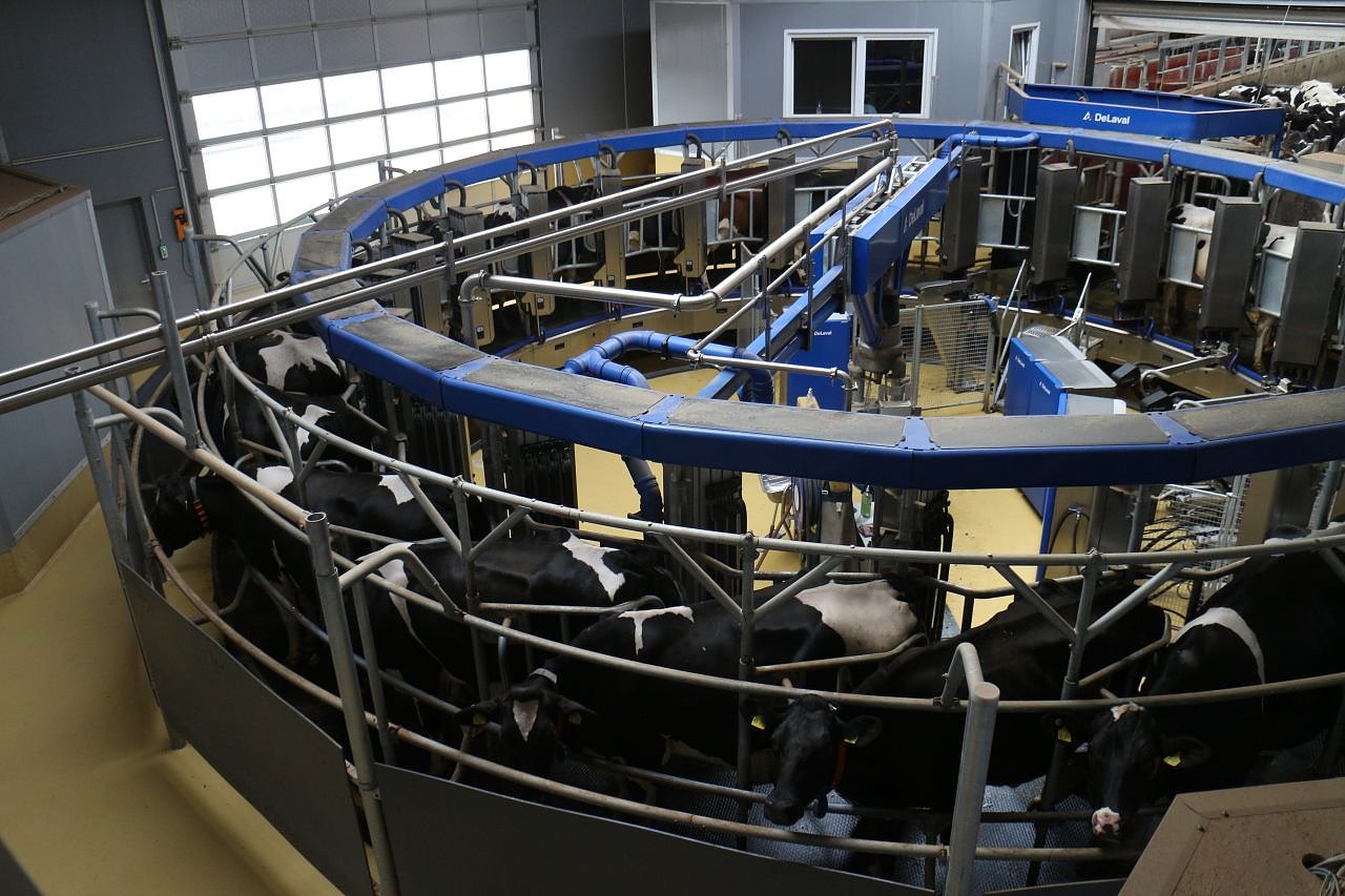 Früher einmal arbeitete man hier mit 2.000 Tieren und 200 Mitarbeitern. Heute schaffen 30 Mitarbeiter den Betrieb bei dem vierfachen an Leistung. Die Technologie macht es möglich. Erst jüngst hat man sich ein neues "Milchkarussell" geleistet, bis zu 90 Tiere können hier pro Stunde abgemolken werden, vollautomatisch, sauber, effizient. Den Mensch braucht es nur noch zu Pflege und Überwachung.