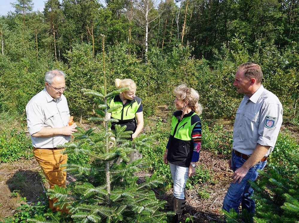 ThüringenForst-Vorstand Jörn Ripken (li.) und die Leiterin des Forstforschungszentrums Gotha, Corinna Geißler, erläutern Forstministerin Birgit Keller (2.v.re.) den Anbauversuch mit der Türkischen Tanne (re. Versuchsleiter Dr. Nico Frischbier) Foto: Dr. Horst Sproßmann - ThüringenForst