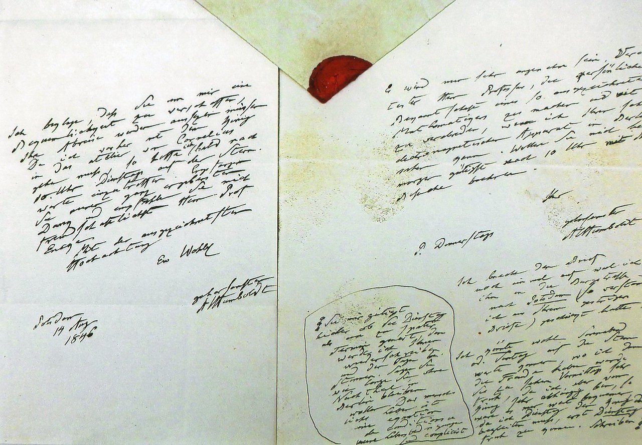 Wenden wir uns August Ephraim Kramer zu. In der Woche vom 27. Juli bis 1. August 1846 führte er nachmittags ab 15.00 Uhr seine Erfindung eines Zeigertelegraphen in Nordhausen vor. Er übertrug Texte aus einer Entfernung von etwa 1,1 km. Auf Kramers Erfindung wird auch Alexander von Humboldt aufmerksam. Am 13. August 1846 schreibt der 77-jährige aus Potsdam, wo er sich als wissenschaftlicher Berater am Königshof Friedrich Wilhelm IV. aufhält, an den Oberlehrer aus Nordhausen: "Es wird mir sehr angenehm sein, verehrtester Herr Professor, die persönliche Bekanntschaft eines so ausgezeichneten Mathematikers zu machen und mit Ihnen zu verabreden, wann ich Ihre schönen elektromagnetischen Apparate in Berlin sehen kann... Ihr gehorsamster A.v. Humboldt". Kramer hatte sich nämlich mit seinem Apparat nach Berlin begeben, wo er die Wirkung den Mitgliedern der Telegraphenkommission und mehreren "Nobilitäten" vorführen wollte.