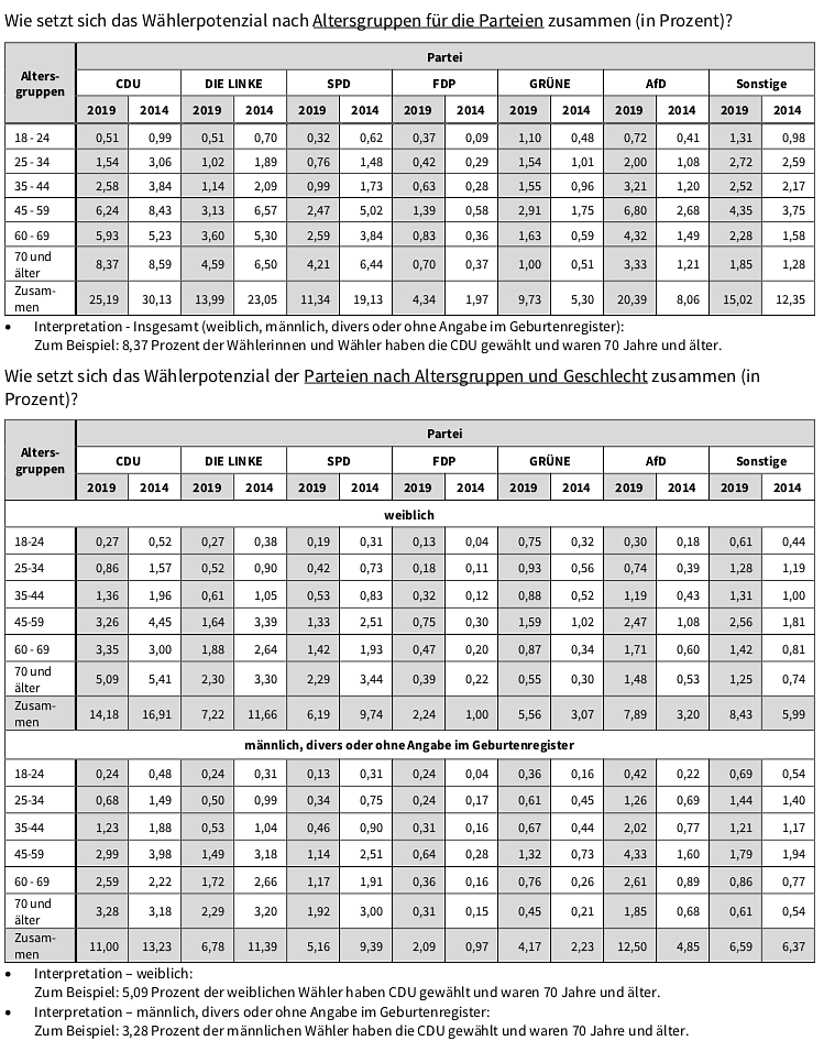 Zur Europawahl am 26. Mai 2019 wurde, wie auch zu der vorangegangenen Europawahl, eine repräsentative Wahlstatistik durchgeführt. Dazu wurden in 83 ausgewählten Thüringer Wahlbezirken Stimmzettel mit 12 unterschiedlichen Aufdrucken über Geburtsjahresgruppen und Geschlecht des Wählers ausgegeben.
