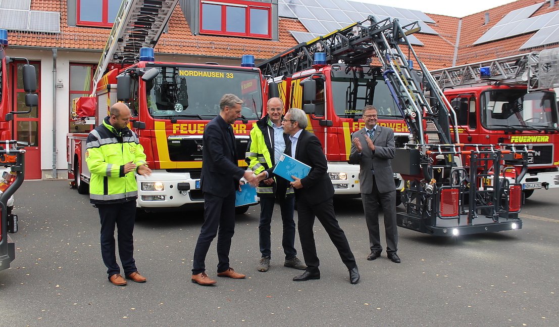 Jetzt haben alle Orte im Landkreis, die aufgrund der Häuserhöhe eine große Drehleiter brauchen können, auch wirklich eine im Zeughaus, freute sich Landrat Matthias Jendricke. Insgesamt sind es acht Drehleitern im Kreis, sechs in den Landgemeinden und zwei in der Stadt Nordhausen, fügte er stolz an. Zweck des heutigen Treffens war die Übergabe zwei nagelneuer Drehleitern an die Weheren in Ellrich und Bleicherode. Die Bleicheröder wiederum geben ihre bisherige an die Wolkramshäuser Feuerwehr weiter und die Ellricher ihre jetzige an die Heringer Wehr.