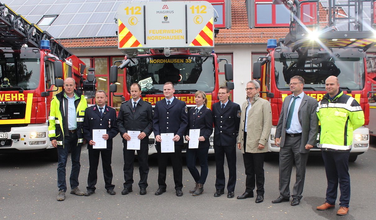 Minister Maier hatte allerdings noch einiges mehr im Gepäck als die beiden Drehleitern, denn er überreichte noch drei weitere Förderbescheide für neue Fahrzeuge. So erhielt die Gemeinde Harztor ein HLF 10 im Werte von 90.000 Euro zugesprochen und zwei weitere HLFs im Werte von jeweils 143 000 Euro sind für die Freiwilligen Feuerwehren in Bleicherode und Liebenrode bestimmt.