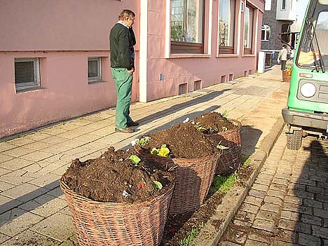Fünf umgestürzte Blumenkörbe, die teilweise auf der Straße lagen, boten heute früh ein trauriges Bild am August-Bebel-Platz. Mitarbeiter der Stadtverwaltung haben in den frühen Morgenstunden aus Sicherheitsgründen Erde und Pflanzen provisorisch zusammengekehrt und die Stadtgärtner müssen nun wieder neu bepflanzen.