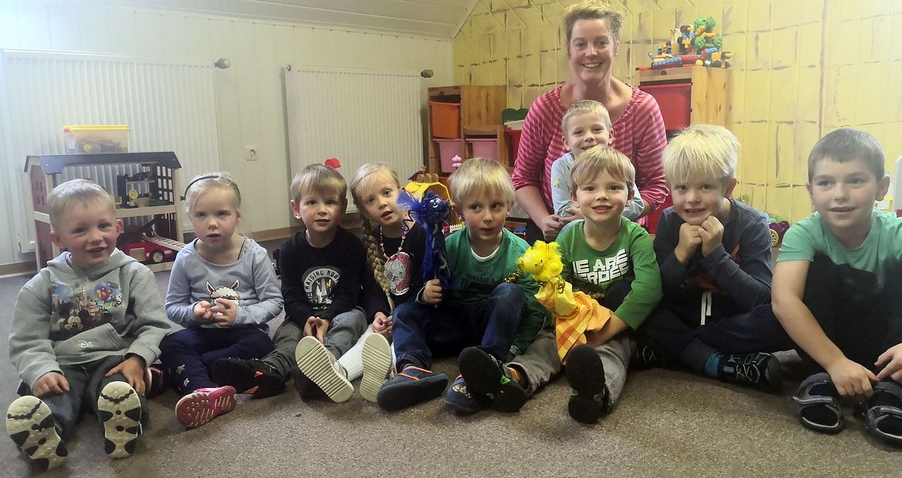 Die Vorschulgruppe der Hohensteiner Burgspatzen mit der Einrichtungsleiterin Ines Heyn und den beiden Stabpuppen Herr Blau und Frau Gelb