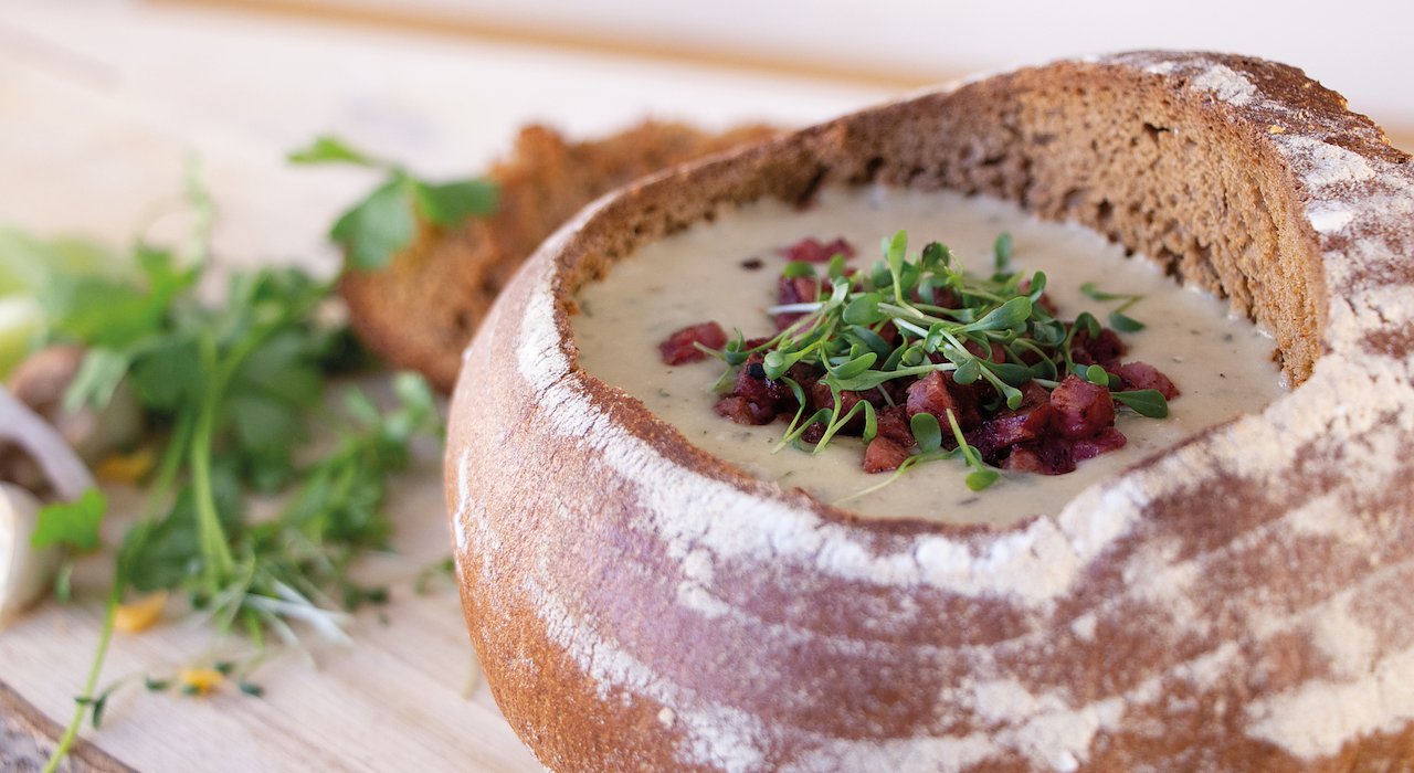Auch heute noch wärmt deftige Hausmannskost an nasskalten Herbsttagen auf und gibt Kraft. Mit wenigen Zutaten lässt sich die einfache Mahlzeit außerdem schnell neu interpretieren. So etwa der Klassiker Kartoffelsuppe: Verfeinert durch Shiitake-Pilze und krossen Speck, erhält die Suppe ein kräftiges Aroma. Für die Zubereitung zunächst Zwiebeln anschwitzen und Shiitake-Pilze kurz anbraten. Danach aus Lauch, geschälten und gewürfelten Kartoffeln, Knoblauchzehen, Gemüsebrühe, Petersilie und Sahne eine cremige Suppe zubereiten. Als Suppenteller dient aufgeschnittenes und ausgehöhltes Brot, das mit geriebenem Käse gefüllt im Backofen nach fünfzehn Minuten schön knusprig ist. Abschließend die Suppe im noch warmen Brotlaib servieren und mit kross gebratenem Speck sowie Kresse dekorieren.