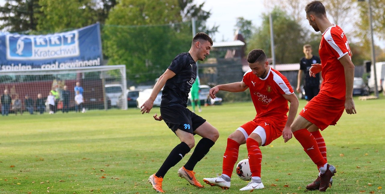 Matteo Andacic entschied mit seinem sehenswerten Treffer den Pokalfight in Altengottern. Hier tanzt er gleich zwei Gegner aus.