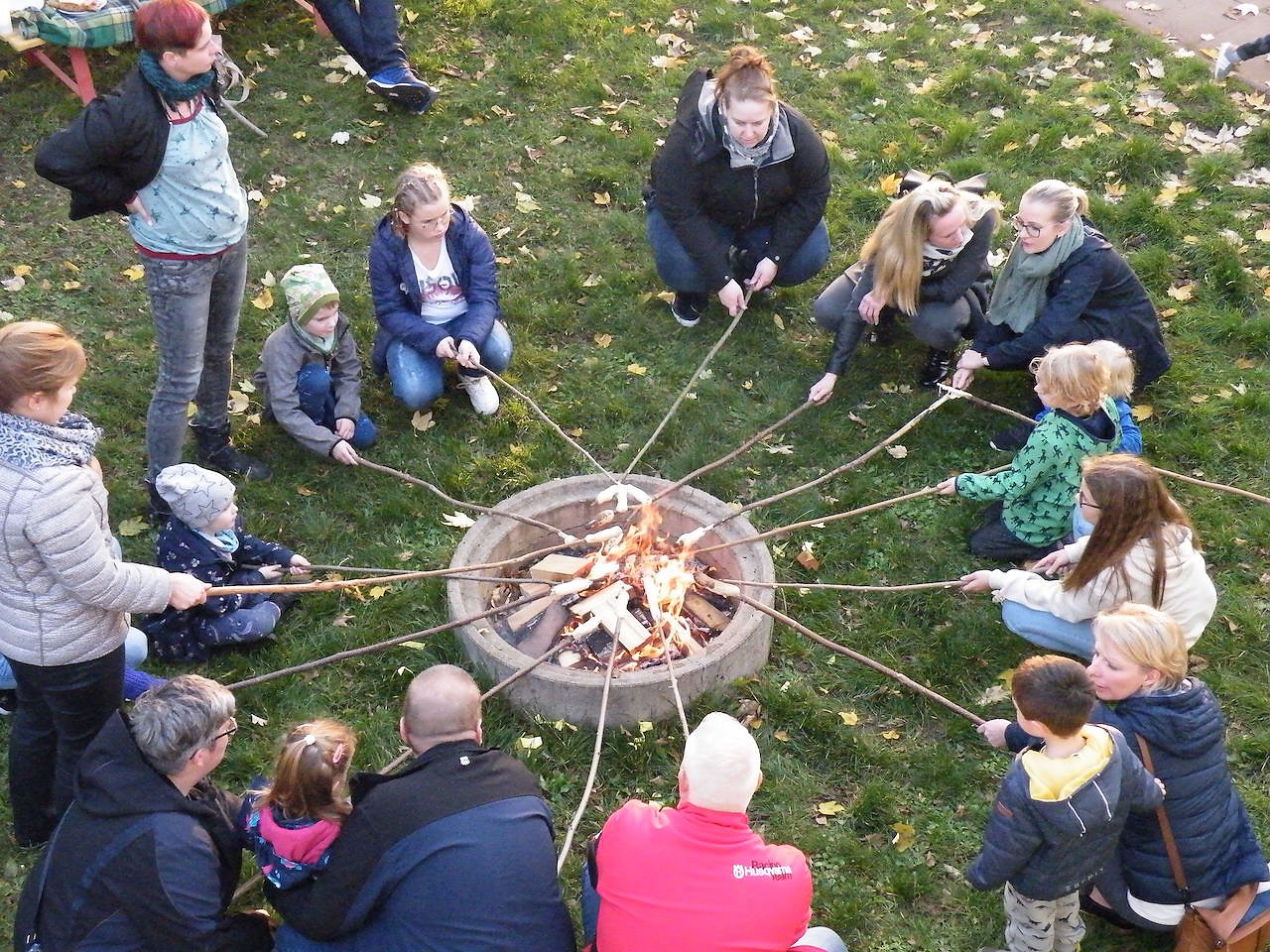 Im Anschluss setzte sich der frühe Abend mit einer Nusssuche auf dem Gelände fort, ein kleines Eichhörnchen hatte überall Wallnüsse verloren, welche die Kinder eifrig einsammelten. Zur Verköstigung gab es neben leckerer Bratwurst auch selbstgemachtes Stockbrot. Am Lagerfeuer ließen die Kinder zusammen mit den Erziehern und Eltern diesen schönen Tag ausklingen.