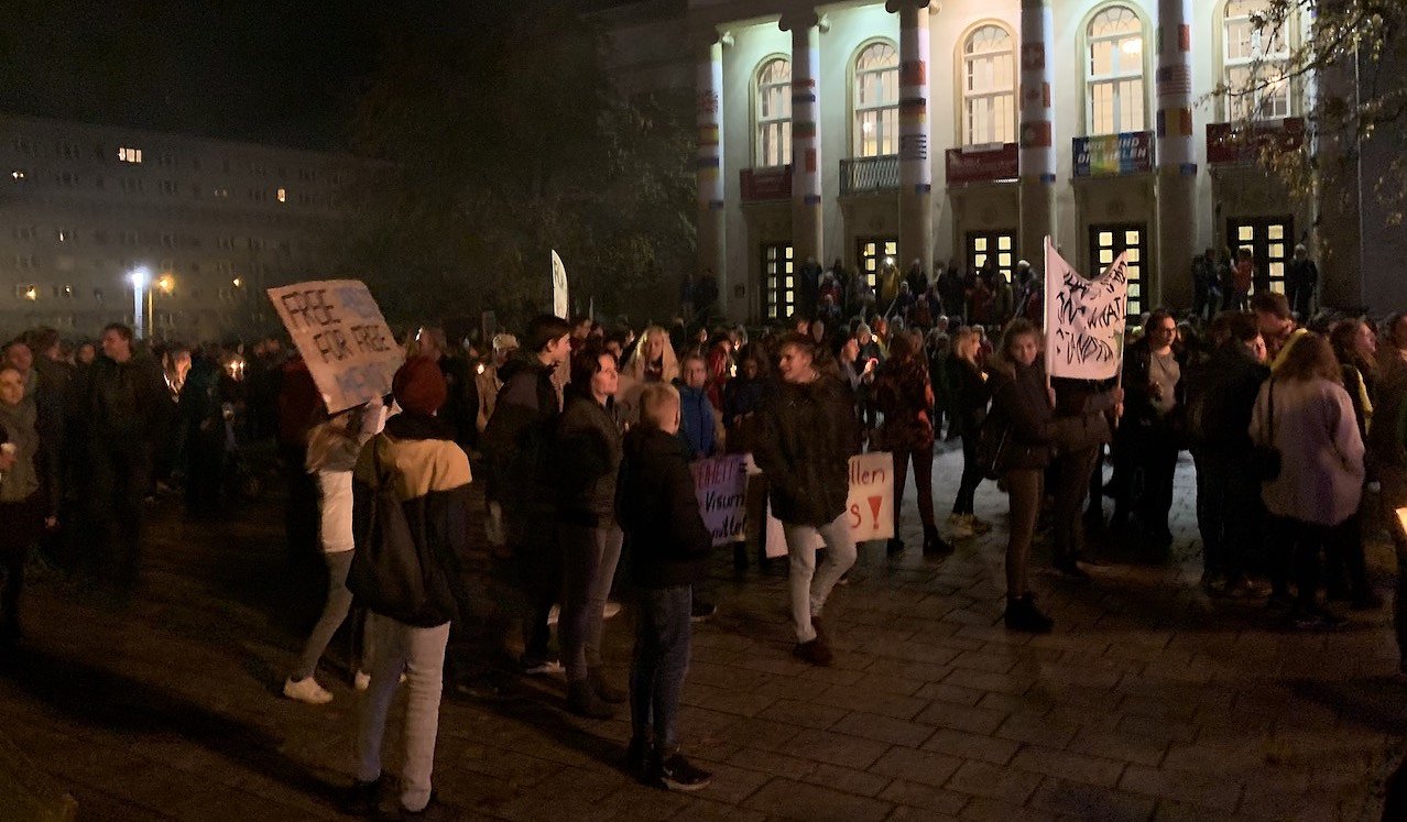 Gegen 18 Uhr trafen die Schüler der Mittel- und Oberstufen auf dem Theaterplatz ein, begleitet von Ordnern in gelben Westen. Einer von ihnen war niemand Geringerer als der Nordhäuser Intendant Daniel Klajner, der maßgeblich an der Entstehung dieses Abends beteiligt war. Erwartet wurden die Demonstranten auf der Bühne bereits von der Nordhäuser Rockband FRANZ KARAFKA, die mit ihren frisch-frechen Titeln für Stimmung sorgte.