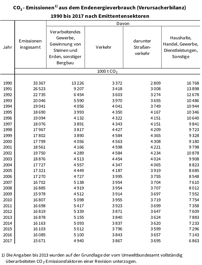 Basierend auf der Energiebilanz des Freistaates erfolgt im Thüringer Landesamt für Statistik die Be- rechnung der energiebedingten CO2-Emissionen vor allem aus dem Verbrauch von fossilen kohlen- stoffhaltigen Energieträgern mit brennstoffspezifischen Emissionsfaktoren. Diese werden vom Um- weltbundesamt verbindlich für alle Länder und den Bund zur Verfügung gestellt.