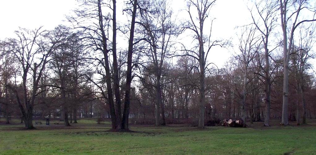 Autor: redStadtförster Axel Axt im Stadtpark. Unter den großen Bäumen im Hintergrund befindet sich rechts im Bild eine stattliche Blutbuche. Sie trieb im Frühjahr Blätter aus, die leider im Sommer wieder eintrockneten. Das Frühjahr wird zeigen, ob der Baum und viele andere noch zu retten sind.