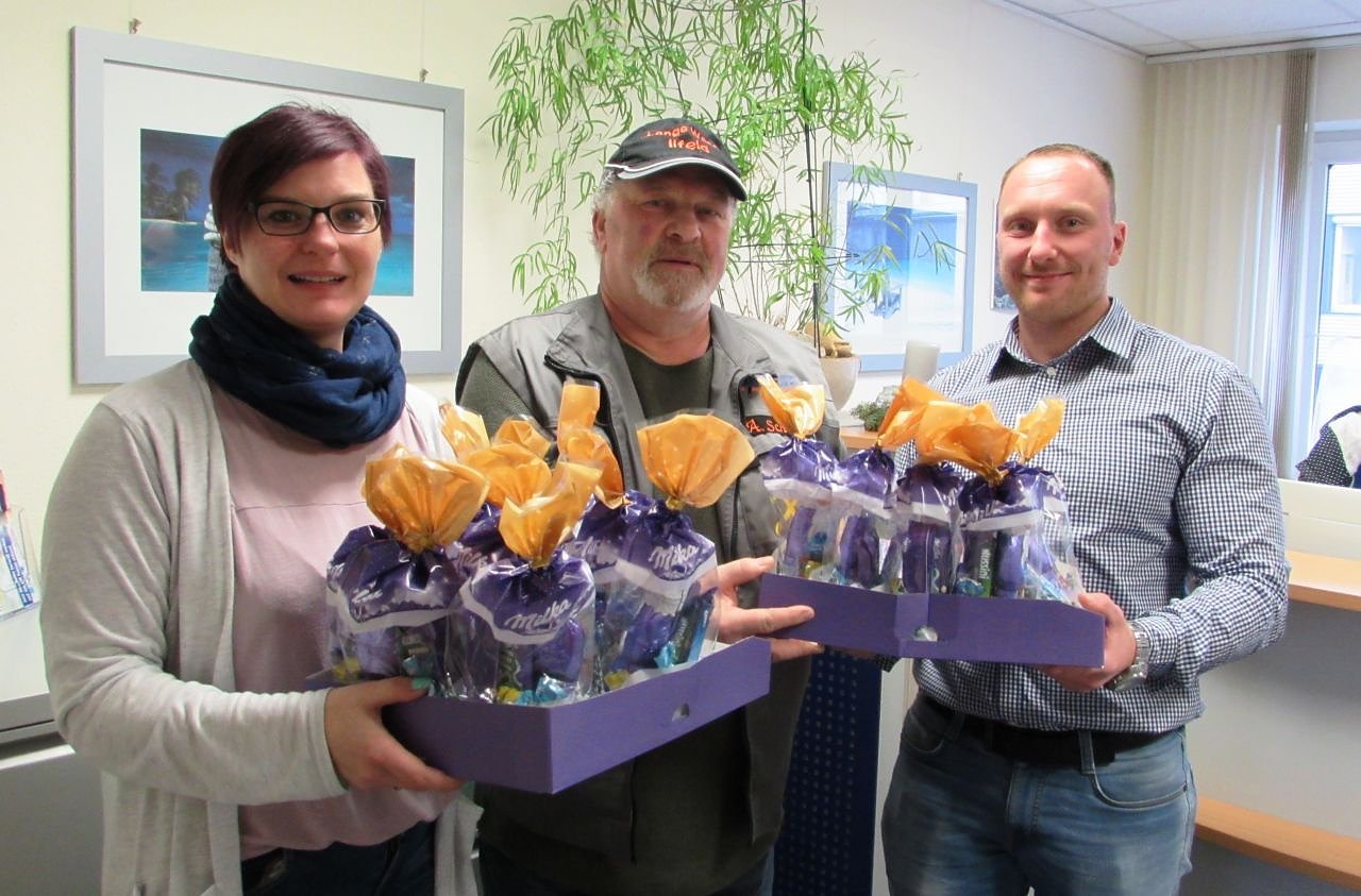 Die Mitarbeiter der GeAT AG Niederlassung Nordhausen überraschten die Bergwerk -und Wanderführergruppe Ilfeld/Wiegersdorf mit einer Süßen Spende für die fleißigen Sternensinger. Die GeAT Mitarbeiter/in, Sindy Michael und Sebastian Rode, übergaben dem Vereinsmitglied der Bergwerk -und Wanderführergruppe, Andreas Schubert, dicke Schokoladenweihnachtsmänner und weitere Leckereien für das bald anstehende Event.