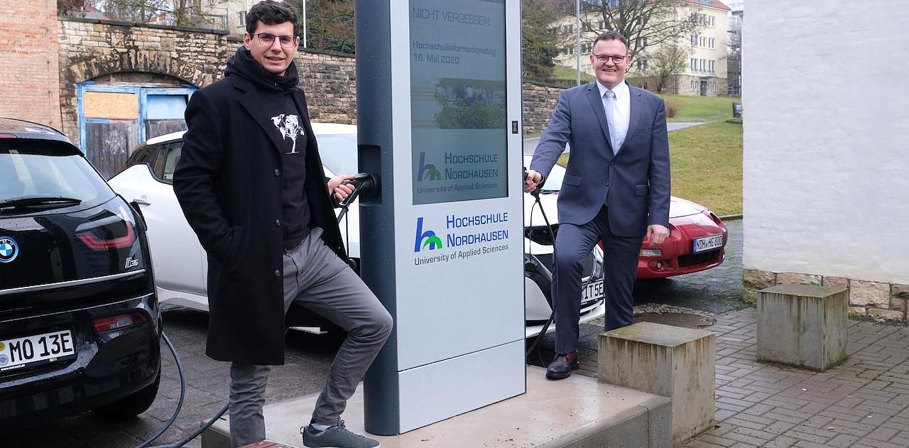 Hochschulpräsident Prof. Dr. Jörg Wagner und der Technische Geschäftsführer von InTraSol, Sebastian Kupfer, nehmen die neue E-Ladestation auf dem Campus in Betrieb