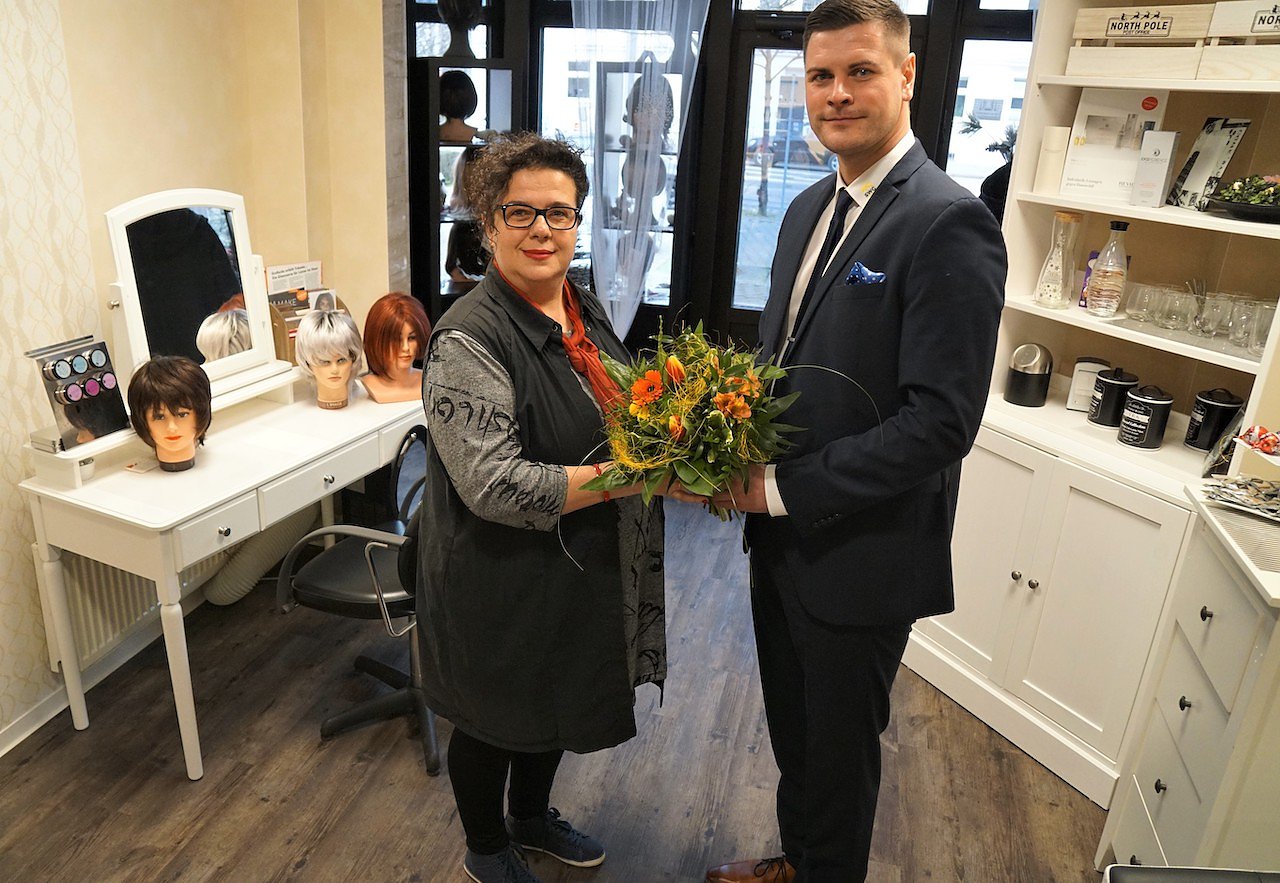 Pascal Wetzler von der SWG überbrachte Anett Vollborth zu ihrer Salonerweiterung Blumen.
