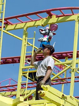 Neben der Maus locken fünf weitere große Fahrgeschäfte, wie das Autoscooter oder der Breakdance. Auf Grund neuer Sicherheitsbestimmungen wurde das Karussell modernisiert. Jetzt kann noch weniger passieren als bisher. Die Anfahrt ist gefährlicher sagt Frank Fischer von der Schausteller Arbeitsgemeinschaft, die sich um die Organisation des Jahrmarktes kümmert. Morgen um 11.00 Uhr ist Sicherheitsabnahme. Dann kommen Polizei, TÜV, Ordnungsamt und Feuerwehr um zu kontrollieren, ob alles in Ordnung ist. Außerdem werden jährlich alle Schweißnähte und alle anderen Teile der Fahrgeschäfte vom TÜV überprüft. Passieren kann also wenig, so dass die Besucher den Spaß genießen dürfen.