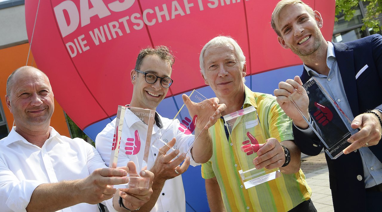 Autor: redDie strahlenden Gewinner des Zukunftspreises 2019 (v.l.): Lutz Strickrodt (Dachdecker Strickrodt & Söhne GmbH), Benjamin Schadow (HÖRSTIL GmbH & Co. KG), Georg Bischoff (Elmü Elektro/Elektronik GmbH), Andreas Püttmann (antignum Holzbau GmbH). Foto: