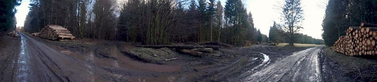 Streift man jedoch von den breiten, kaum noch begehbaren Wegen in den Forst, stellt man fest, dass dort auch große Flächen kahl geschlagen wurden, die grüne Kronen hatten, deren Rinde keine Käferzeichnung hat und die Baumscheiben auch keinen Anhalt für eine Erkrankung geben. Rings umher ist die Natur großflächig verwüstet, tiefe Schlammgleise der Maschinen und Rücketätigkeiten hinterlassen ein Inferno, das früher oft beseitigt, heute sich selbst überlassen bleibt. Die Rodekommandos ziehen dann eben weiter, es stehen einfach zu viele Bäume vor dem Wald.